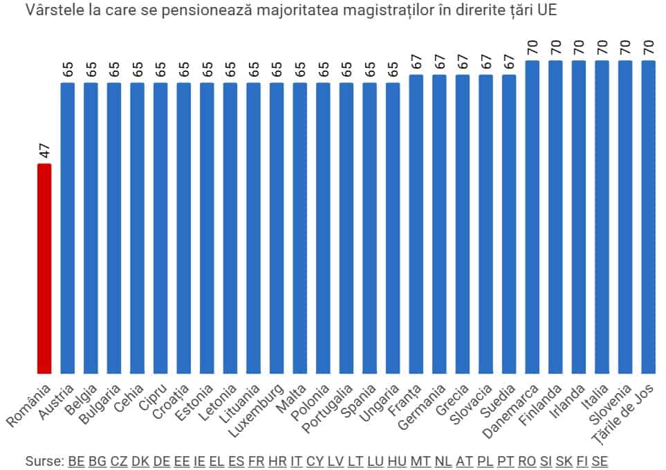 De asemenea, România este singura țară din UE (cel puțin) unde magistrații se pensionează sub 50 de ani (media de vârstă de la finalul anului trecut) sau sub 60 de ani.