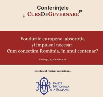 București, 29 ianuarie 2018, Banca Națională a României. Organizator: CursDeGuvernare.ro, cu sprijinul BNR. Conferința: Fondurile europene, absorbția și impulsul necesar. Cum conectăm România, în anul centenar? Guvernatorul Mugur Isărescu, Comisarul european Corina Crețu și alți 13 speakeri de top, din mediul de afaceri, think-tankuri și mediul bancar, mass-media.