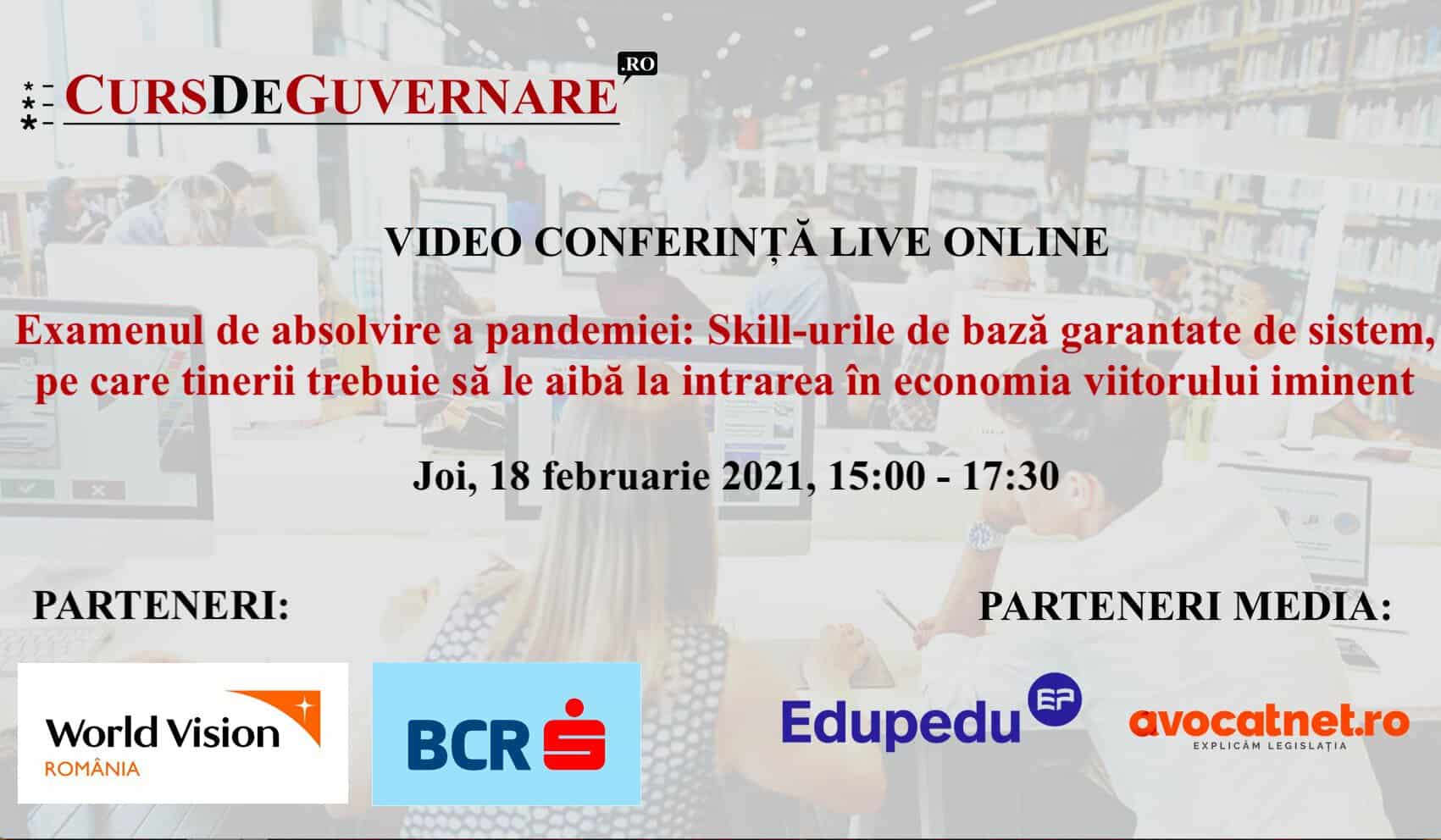 Joi, 18 februarie 2021, București. VIDEO CONFERINȚA „Examenul de absolvire a pandemiei: Skill-urile de bază garantate de sistem, pe care tinerii trebuie să le aibă la intrarea în economia viitorului iminent”. Organizator: CursDeGuvernare.ro.